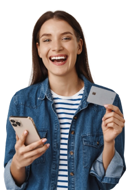 Mãos femininas segurando um smartphone e um cartão alimentação Urbipay